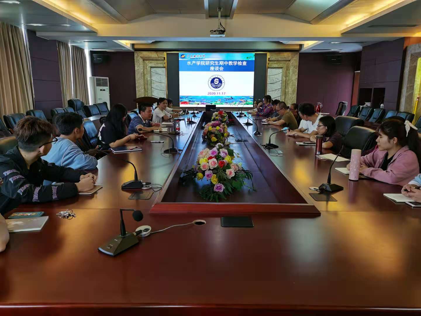 11月17日中午,学院在水产楼216会议室召开研究生期中教学检查师生座谈会。学院副院长邓岳文教授、实验教学中心主任李长玲教授、水医系副主任蔡佳博士、研究生辅导员及博士、硕士、留学生代表共20余人参加了座谈会,会议由邓岳文主持。