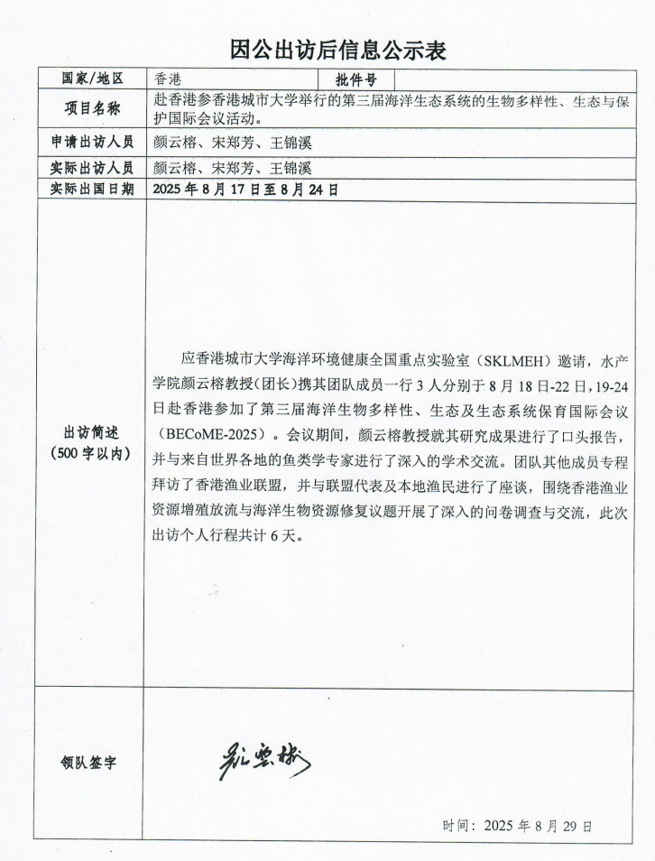 根据《关于进一步规范省部级以下国家工作人员因公临时出国的意见》的要求,现将广东海洋大学因公出访信息予以公示(详见附件)。公示时间为2025年9月2日至9月8日。如有意见,请在公示期内,向相关单位反映。