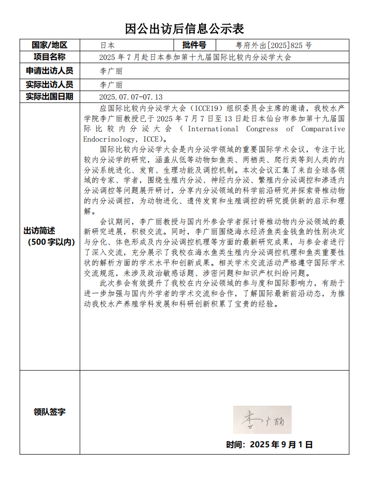 根据《关于进一步规范省部级以下国家工作人员因公临时出国的意见》的要求,现将广东海洋大学因公出访信息予以公示(详见附件)。公示时间为2025年9月1日至9月5日。如有意见,请在公示期内,向相关单位反映。