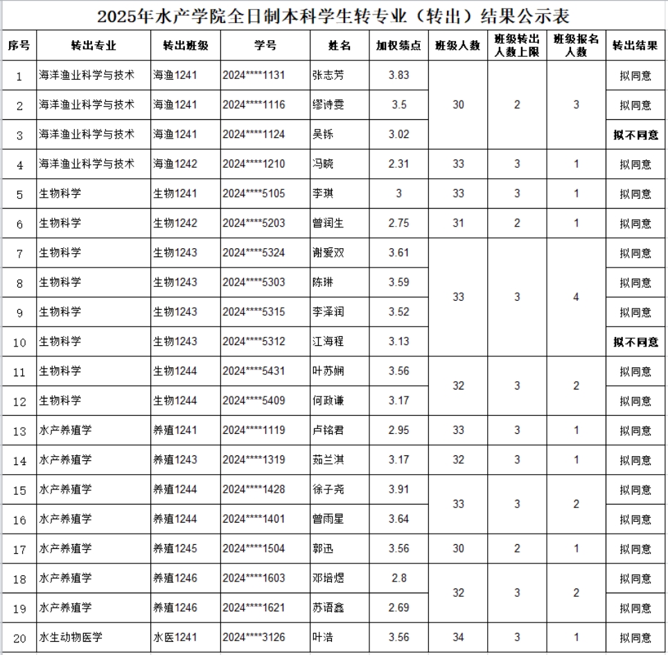 根据《广东海洋大学全日制本科学生转专业管理规定》(校教务〔2019〕60号)文件精神及教务处《关于做好2025年度转专业工作的通知》《2025年william威廉中文官网全日制本科学生转专业遴选实施细则》的工作要求,经学生个人申请、学院遴选、学院转专业工作领导小组进行审议,拟同意张志芳等18名同学转出,拟不同意吴铄等2名同学转出(详见附表),现予以公示。