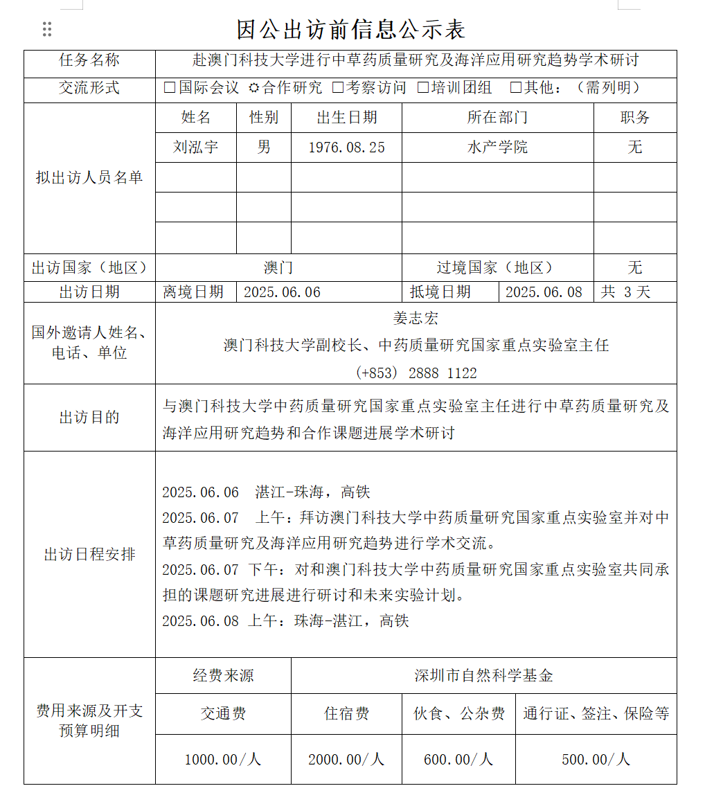 根据《关于进一步规范省部级以下国家工作人员因公临时出国的意见》的要求,现将广东海洋大学william威廉中文官网因公出访信息予以公示(详见附件)。公示时间为2025年5月19日至5月23日。如有意见,请在公示期内,向相关单位反映。