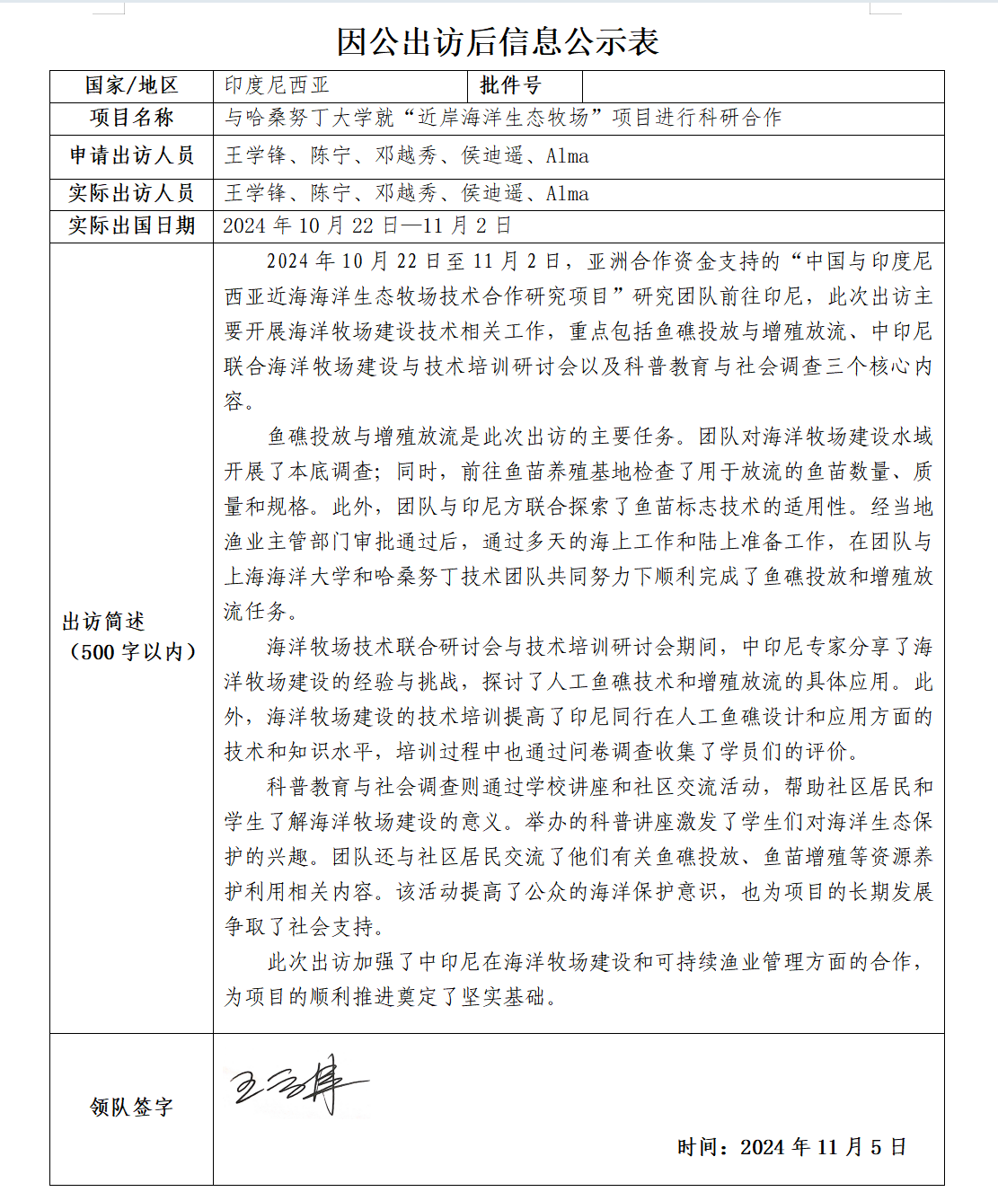 根据《关于进一步规范省部级以下国家工作人员因公临时出国的意见》的要求,现将广东海洋大学因公出访信息予以公示(详见附件)。公示时间为2024年11月06日至11月12日。如有意见,请在公示期内,向相关单位反映。