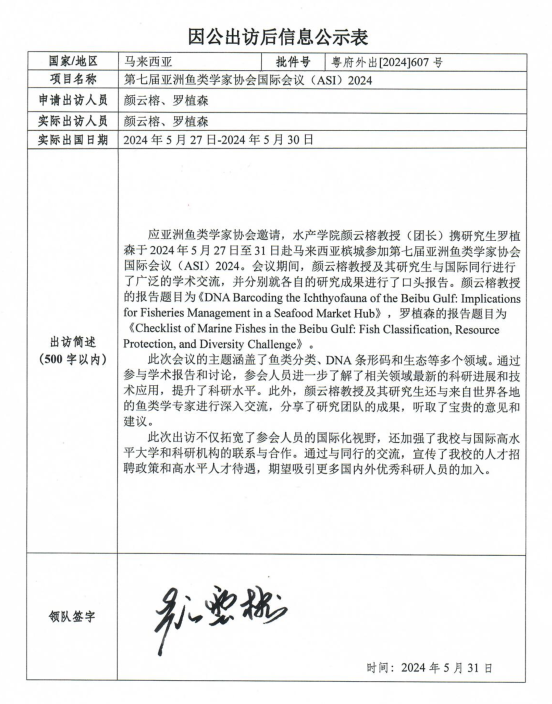 根据《关于进一步规范省部级以下国家工作人员因公临时出国的意见》的要求,现将广东海洋大学因公出访信息予以公示(详见附件)。公示时间为2024年6月4日开始,公示期为5个工作日。如有意见,请在公示期内,向相关单位反映。