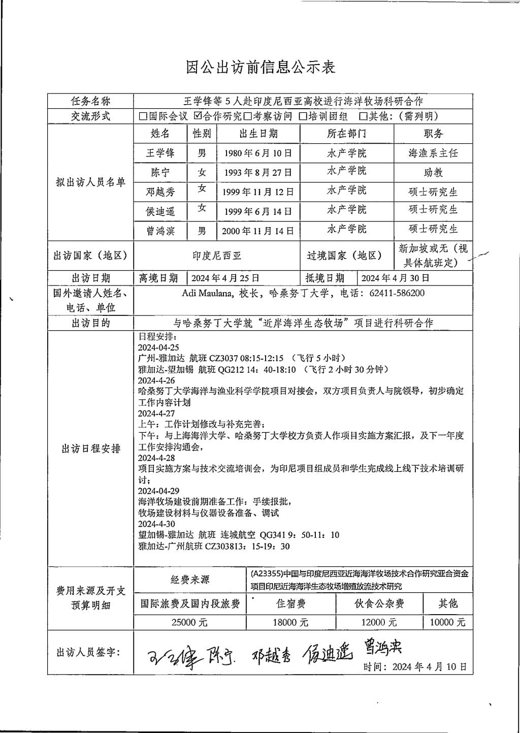 根据《关于进一步规范省部级以下国家工作人员因公临时出国的意见》的要求,现将广东海洋大学因公出访信息予以公示(详见附件)。公示时间为2024年4月10日至4月14日。如有意见,请在公示期内,向相关单位反映。