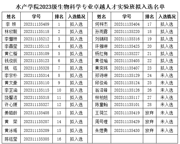 根据学校《广东海洋大学“双百工程”本科人才培养模式改革方案(试行)》(校〔2010〕16号)、教务处《广东海洋大学关于开展卓越人才教育培养计划改革试点工作的意见》(校教务〔2015〕71号)、学院《关于2023级生物科学专业“卓越人才教育培养计划实验班”学生选拔的通知》的精神和要求,学院组织开展2023级生物科学专业“卓越人才教育培养计划实验班”学生选拔工作。经学生个人申请、选拔工作小组资格审查和综合面试,现将拟入选名单公示如下:
