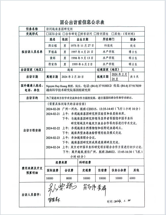 根据《关于进一步规范省部级以下国家工作人员因公临时出国的意见》的要求,现将广东海洋大学因公出访信息予以公示(详见附件)。公示时间为2024年1月30日至2月6日。如有意见,请在公示期内,向相关单位反映。