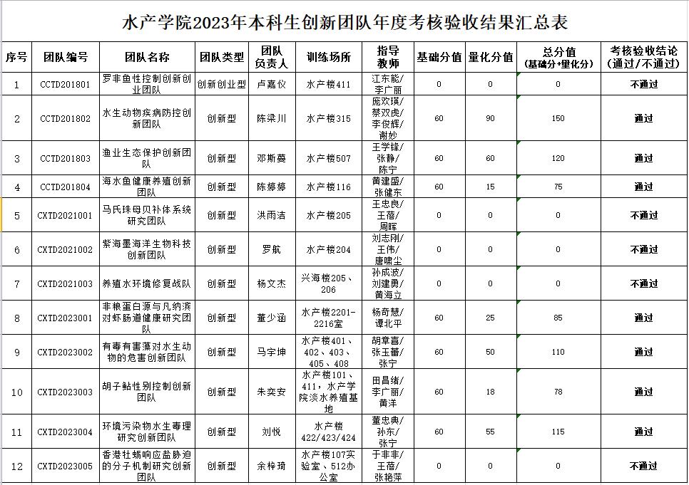 根据《广东海洋大学学生创新团队管理办法》(校〔2023〕24号)、《关于做好2023年学生创新团队立项申报和考核验收工作的通知》(校〔2023〕68号)的工作要求,学院组织专家对12项本科生创新团队开展年度考核验收工作。考核验收专家审阅了创新团队提交的材料,对照考核标准进行考核验收,现将考核验收结果公示(详见附表)。