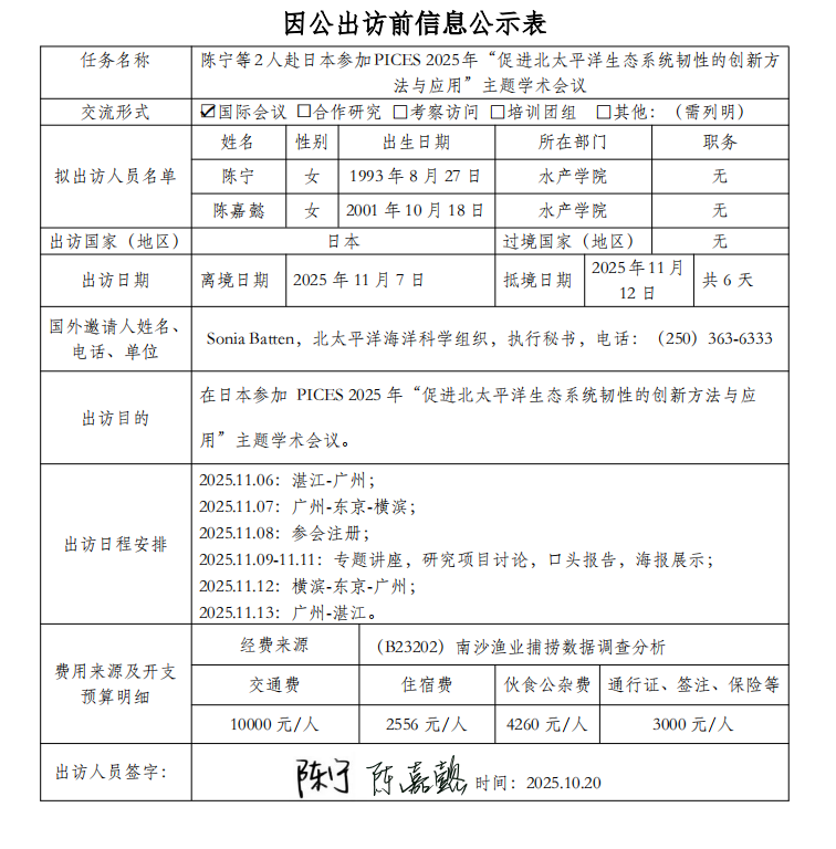 根据《关于进一步规范省部级以下国家工作人员因公临时出国的意见》的要求,现将广东海洋大学因公出访信息予以公示(详见附件)。公示时间为2025年10月20日至10月24日。如有意见,请在公示期内,向相关单位反映。