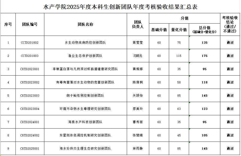 根据《广东海洋大学学生创新团队管理办法》(校〔2023〕24号)、《关于做好我校2025年学生创新团队立项申报和考核验收工作的通知》(校〔2025〕56号)的工作要求,学院组织开展年度考核验收工作。经团队提交材料、学院形式审查,学院组织专家对提交材料对照标准进行审核,现将年度考核验收结果公示(详见附表)。