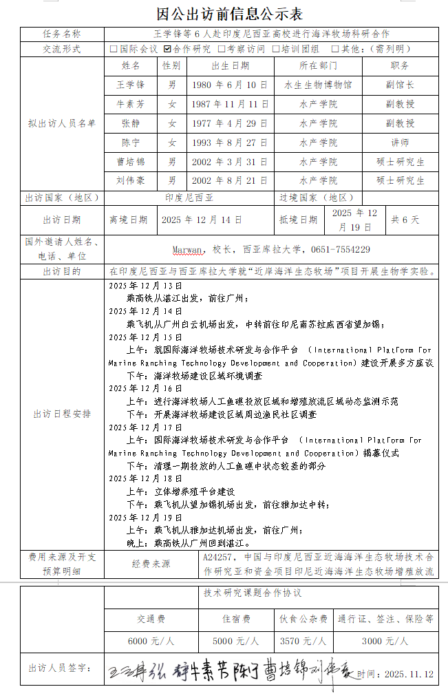 根据《关于进一步规范省部级以下国家工作人员因公临时出国的意见》的要求,现将广东海洋大学因公出访信息予以公示(详见附件)。公示时间为2025年11月12日至11月18日。如有意见,请在公示期内,向相关单位反映。