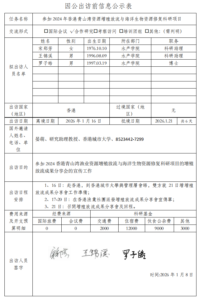 根据《关于进一步规范省部级以下国家工作人员因公临时出国的意见》的要求,现将广东海洋大学因公出访信息予以公示(详见附件)。公示时间为2026年1月9日至1月15日。如有意见,请在公示期内,向相关单位反映。