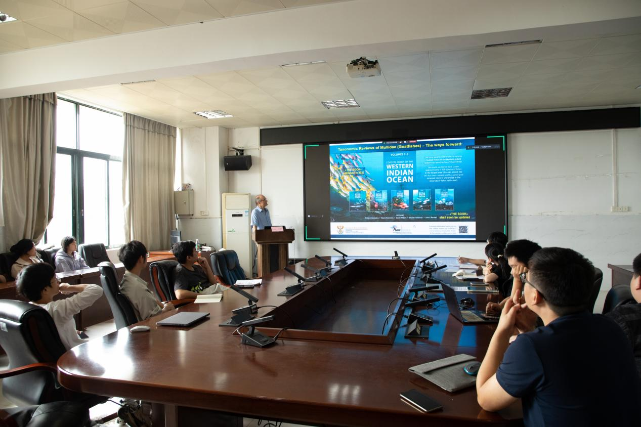 首场报告以“Behaviour of deep-sea fishes:in situandex situapproaches”为主题,Uiblein教授深入探讨了深海鱼类行为生态学的最新研究进展,包括色彩模式多样性以及其生态与进化意义。通过详实的数据和生动案例,Uiblein教授揭示了深海鱼类行为和适应机制的复杂性,强调了深海生物生态研究的重要性。第二场报告以“Ecology and diversity of goatfishes: exploring the ocean coasts for barbels, bars and stripes”为题,聚焦于羊鱼科(Mullidae)鱼类的分类、生态意义和现有多样性。Uiblein教授分享了羊鱼科鱼类在生态系统中的独特作用和重要价值,展示了多个新物种的形态特征及其多样性模式,进一步凸显了羊鱼科在海洋生态学和分类学研究中的重要地位。会后,Uiblein教授针对师生提出的问题进行了详尽的解答,进一步促进了学术交流与知识共享。