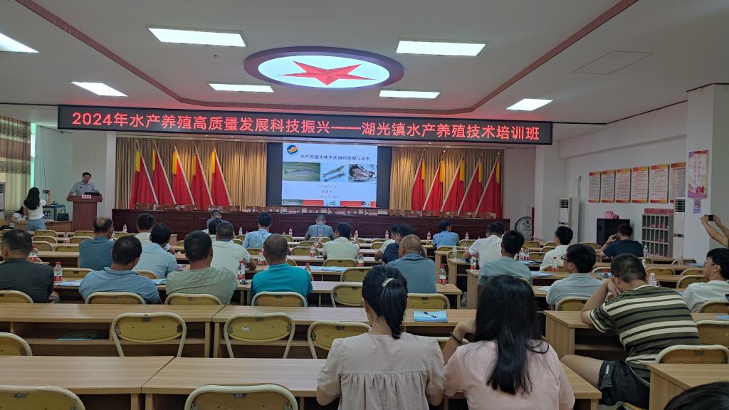 2024年8月14日,湖光镇水产养殖技术培训班在湖光镇政府大楼会议室举办。本次培训班由湖光镇人民政府主办,湛江市水生生物保健品行业协会、广东海洋大学、湛江市水产技术推广中心站、湛江市水产学会、广州派驻湛江市麻章区湖光镇帮镇扶村工作队以及湛江市海洋产业人才培训基地等共同策划和组织。广州派驻湛江市麻章区湖光镇帮镇扶村工作队队长赵四海、省农村科技特派员杨世平副教授、湛江市水产技术推广中心站蔡强高级工程师,以及企业代表、湖光镇养殖户参加了本次培训。
