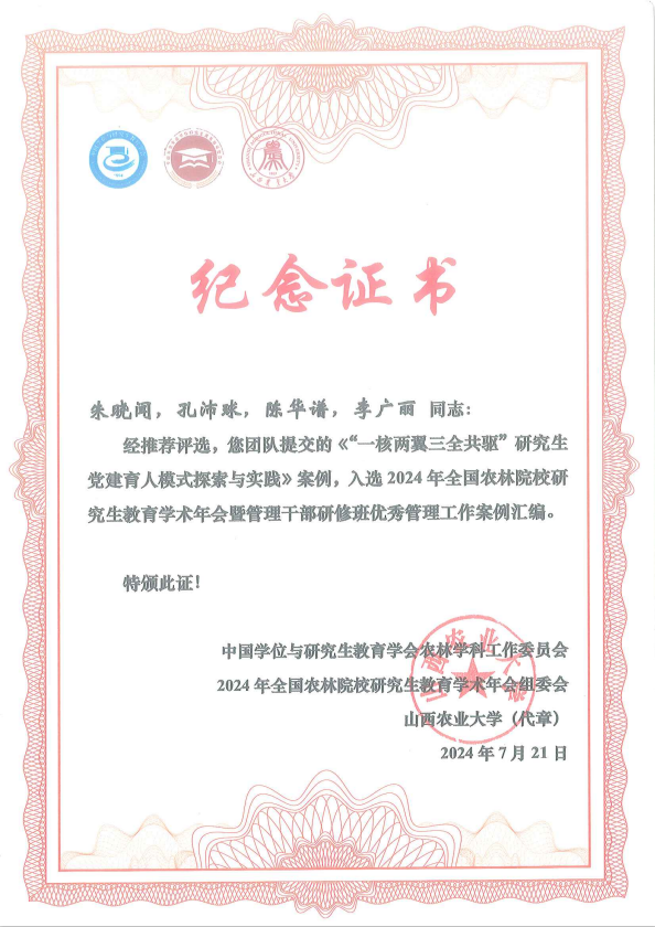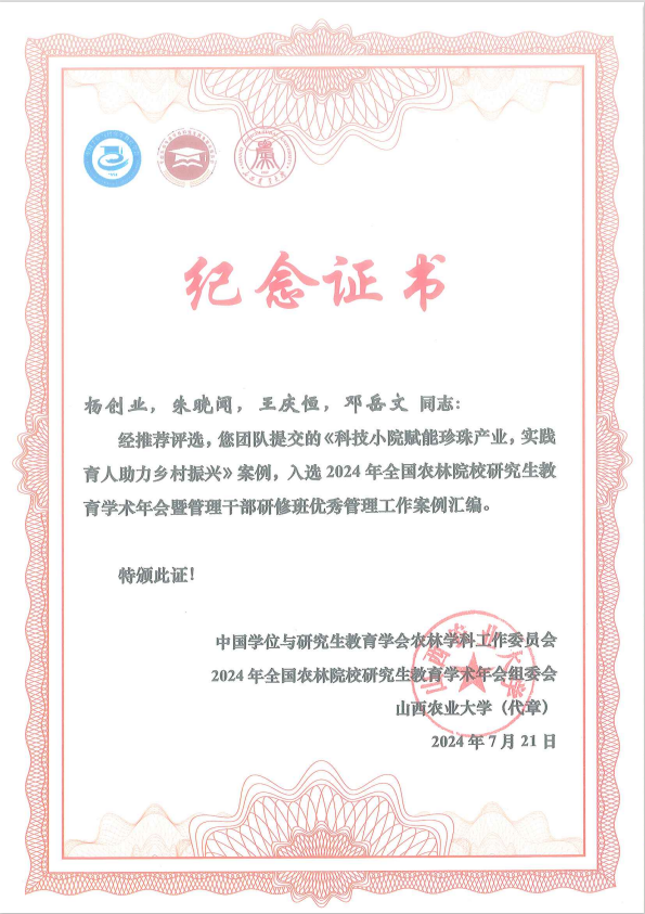 此次会议共遴选了74个优秀培养案例,我院朱晓闻等撰写的《“一核两翼三全共驱”研究生党建育人模式探索与实践》,杨创业等撰写的《科技小院赋能珍珠产业,实践育人助理乡村振兴》成功入选,充分展示了我院研究生培养的特色与亮点,受到全国农林高校的广泛关注和认可。