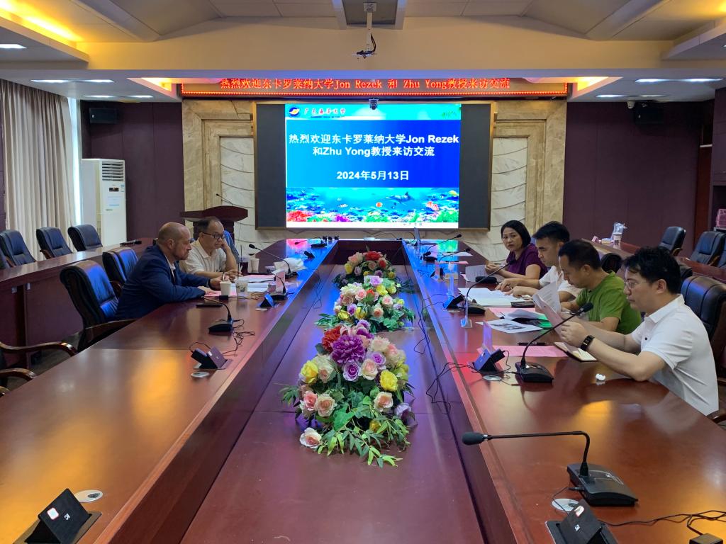 下午,李广丽院长在水产楼216会议室主持召开了关于东卡罗莱纳大学—广东海洋大学“3+2”人才培养项目实施方案的研讨会。双方围绕项目的具体实施细节进行了深入探讨,共同商讨如何优化方案、提升培养质量。李院长指出,“3+2”项目的实施,标志着东卡罗莱纳大学和广东海洋大学校际深度合作的新起点,这不仅将开拓我校师生的学术视野,更将为培养国际化人才搭建起新的桥梁,为促进两校学术交流与人才培养注入新的动力。Rezek教授表示,将以此次交流活动为契机,加快推动东卡罗莱纳大学与广东海洋大学在国际化人才培养方面的深度和广度。学院陈华谱副院长、孔沛球副书记,水产养殖系主任王忠良、海洋渔业科学与技术系副主任李忠炉等参加了研讨会。