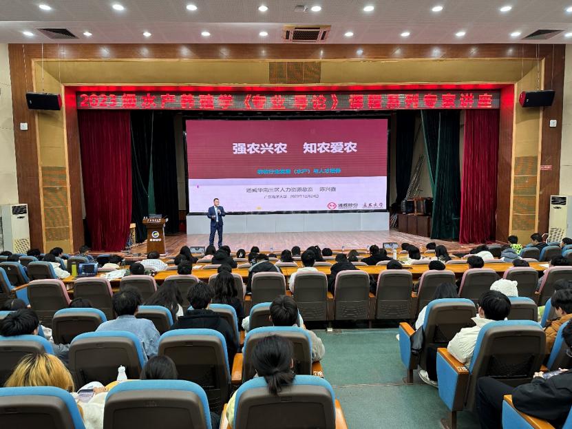 第一场讲座的主讲人是通威集团华南三区人力资源部陈兴鑫总监和我院水产养殖系刘建勇教授,分别围绕《强农兴农,知农爱农,农牧行业发展(水产)与人才培养》和《南美白对虾养殖与种业发展现状》开展。