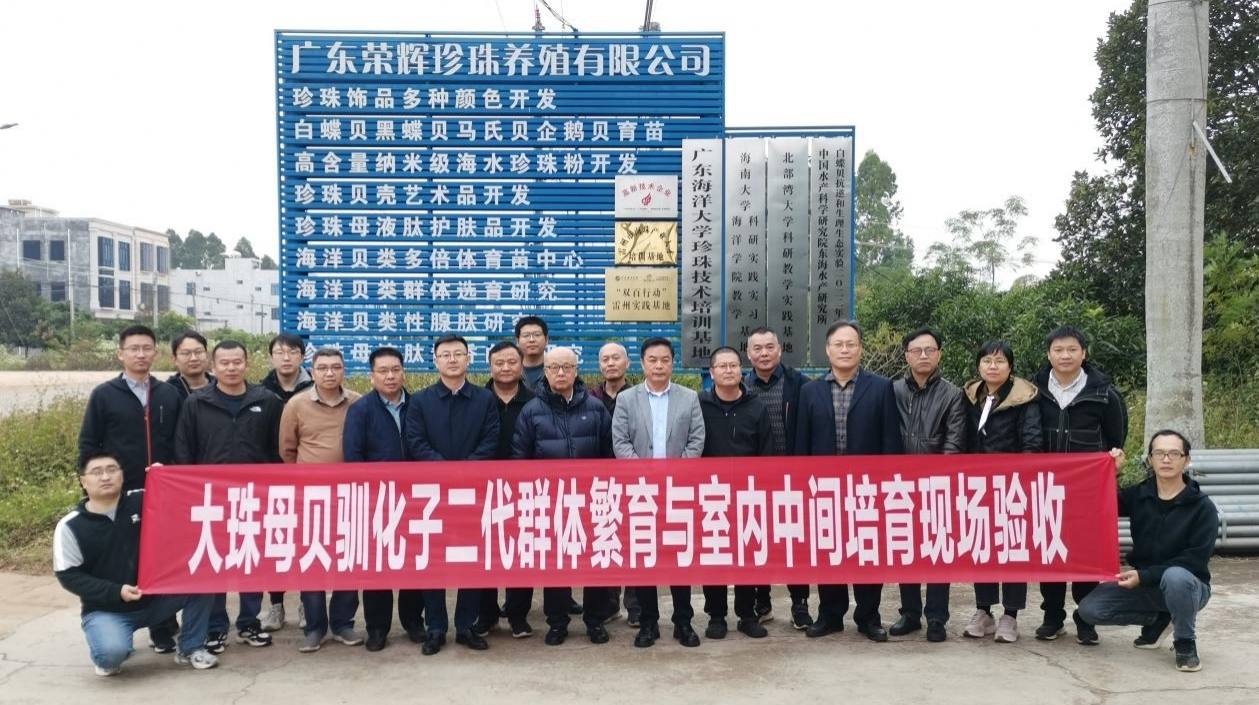 12月17日,广东海洋大学科学技术部组织专家在雷州市覃斗镇对广东海洋大学承担的国家贝类产业技术体系海水珍珠贝养殖与育珠岗位专项年度实施任务进行了现场验收,验收内容为大珠母贝驯化群体海区养殖与室内水泥池中间培育。专家组考察现场,查看记录,并随机抽样测量统计了大珠母贝驯化群体海区养殖与室内池中间培育苗种规格与苗种数量,听取了项目组关于大珠母贝驯化群体海区养殖与室内池中间培育的工作汇报。项目组于2023年繁育了大珠母贝子二代群体,并开展了子代群体室内水泥池和海区养殖比较试验。经过2个月养殖后,室内水泥池与海区养殖的子一代成活率分别为71.2%和8.7%,平均壳长分别为1.94±0.12cm和1.88±0.10cm;室内水泥池与海区养殖子二代成活率分别为79.5%和14.5%,平均壳长分别为1.90±0.07cm和1.84±0.03cm。
