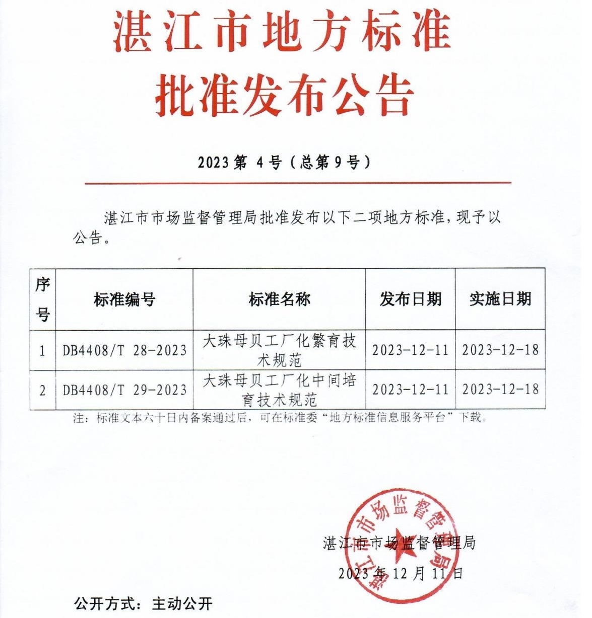 图3地方标准《大珠母贝工厂化繁育技术规范》和《大珠母贝工厂化中间培育技术规范》批准发布