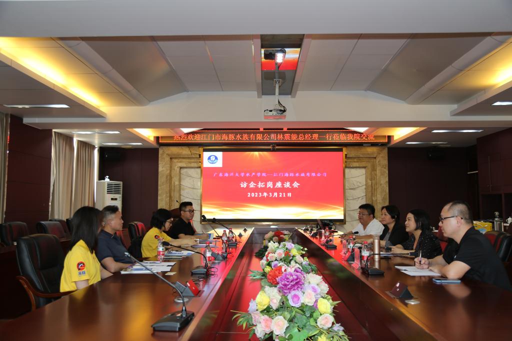 3月21日, 江门市蓬江区海豚水族有限公司林震能董事长一行回访william威廉中文官网,院长李广丽、副院长杨奇慧、海渔系主任王学锋、水医系副主任蔡佳及党政办主任孔沛球等出席座谈会。