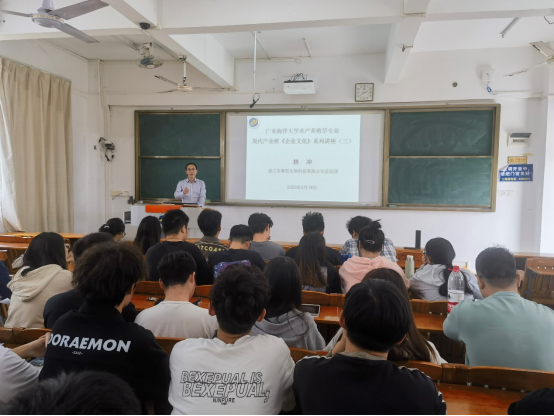 3月14日下午,应我院邀请,湛江市粤凯生物科技有限公司总经理林冲在明德楼B3102教室,为我院现代产业学院2021级产业班学生讲授《企业文化》课程第三讲。