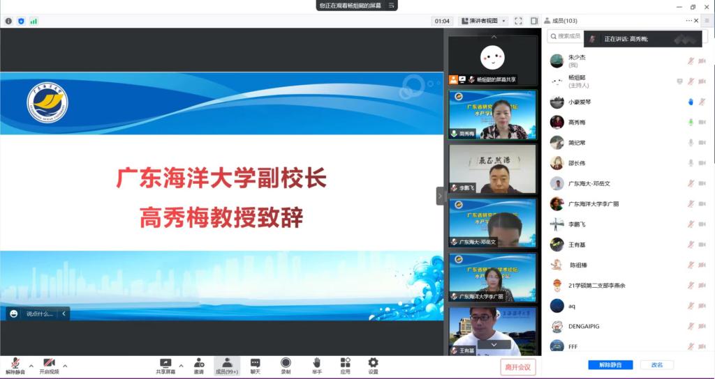 副校长高秀梅做了热情洋溢的致辞,向参会的师生表示欢迎,简要介绍了学校以及水产学科的特色。高秀梅指出,论坛以“智慧渔业、绿色发展”为主题,紧扣国家渔业科技发展形势,符合我校高水平海洋大学建设内涵,希望通过此次“云端”,盛会,加深对智慧渔业的理解,拓宽师生研究思路。最后高秀梅对参会研究生提出了三点期望:一是要加强合作交流,二是要推动科技创新,三是要相互促进提高,希望大家再次到美丽的广东海洋大学相聚。