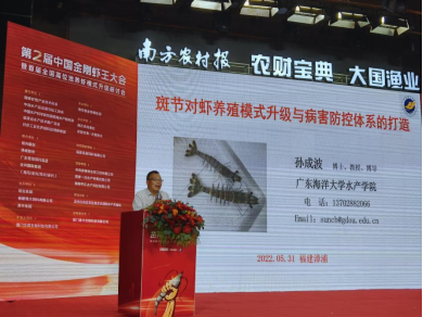漳浦是我国金刚虾主要养殖区,单产最高达到15000斤/亩,中国金刚虾大会已在福建漳浦连续举办两年,我院孙成波教授连续两届受邀参加并作主题报告,2021年第一届报告题目“斑节对虾(金刚虾)高密度养殖常见病害与环境控制”,本届大会报告题目“金刚虾(斑节对虾)养殖模式升级与病害防控体系的打造”。通过构建对虾地膜池硬件设施化工程化技术体系、养殖尾水减排技术和对虾高位池养殖尾水处理技术,促进金刚虾养殖模式升级和对虾产业可持续发展。孙成波教授连续2年应邀参会并作主题报告,极大地提高了学校、学院的知名度及影响力,助力我院水产学科更好更快地发展。