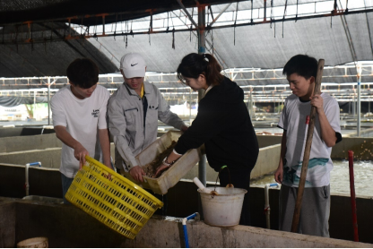 4月30日,吕博士带队来到了明珠水产科技有限公司雷州东风螺育苗场和龙利东风螺养殖场。在龙利养殖场,养殖场有关负责人带领队员们参观了养殖场内设施,介绍了东风螺目前的生长情况,现场投喂饵料,观察东风螺摄食情况,并对广东海洋大学培育的耐低盐品系的生长性能给予高度肯定。