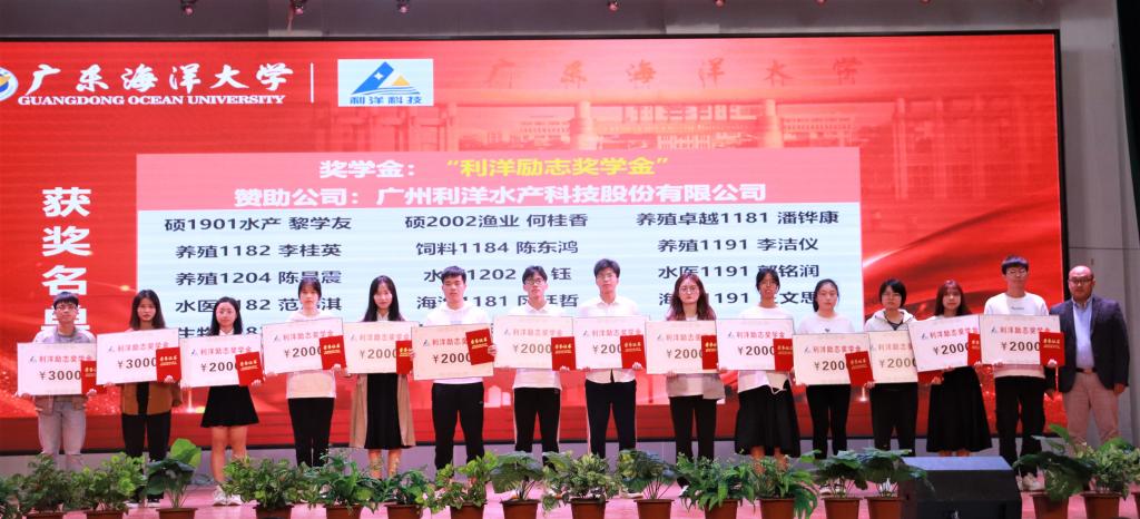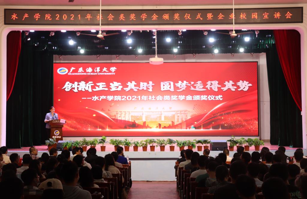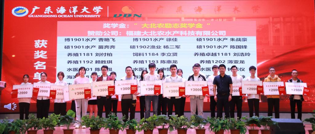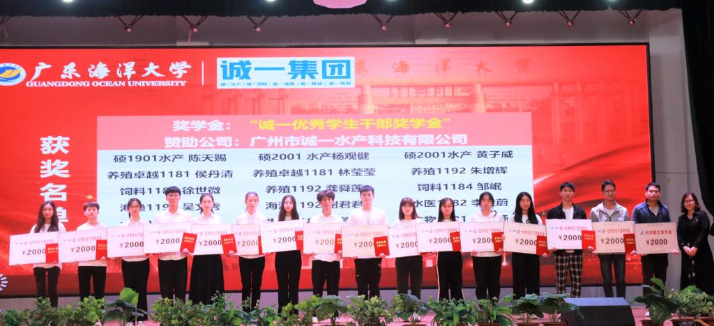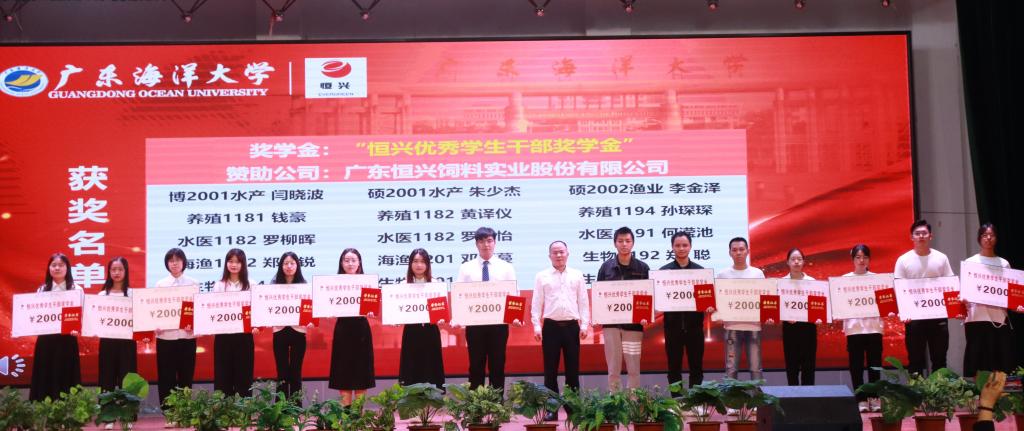 院长助理陈华谱副教授宣读william威廉中文官网2020-2021学年获社会类奖学金的66名学生名单。福建大北农水产科技有限公司、广州利洋水产科技股份有限公司、广州市诚一水产科技有限公司、广东恒兴饲料实业股份有限公司等设奖单位代表依次为获奖学生颁发荣誉证书。