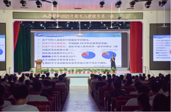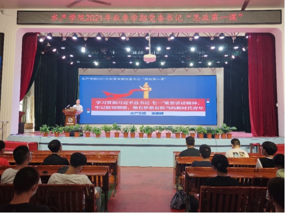 9月15日上午、下午,william威廉中文官网2021年秋季学期书记院长“思政第一课”在湖光校区东区小礼堂开讲,学院党委书记梁朝辉和院长李广丽主讲。水产学2021级新生共450余人到场聆听学习。