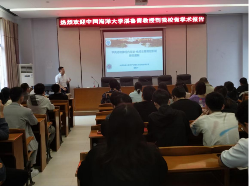 潘鲁青教授首先从种质退化、渔业环境恶化和病害频繁发生等方面指出,环境污染和病害问题已成为甲壳动物养殖业最为突出的风险因素,而甲壳动物在环境应激下如何进行免疫防御调控已成为当前病害防控的重要问题。通过系统的实验研究,潘教授团队发现,甲壳动物中枢神经系统和神经内分泌器官释放的神经递质和神经激素,如BA和CHH等,能与血细胞膜上的特异性受体结合,这些神经内分泌因子将细胞外信号传递到细胞内区域,并通过改变第二信使、蛋白激酶和核转录因子来调节免疫行为。潘鲁青教授的报告系统阐述了甲壳动物神经内分泌-免疫生理调控机制的研究进展,报告内容丰富,理论与实践相结合,对水产学科相关研究工作起到了重要的启迪作用。报告期间,潘鲁青教授同现场师生进行了热烈的交流,并详细回答了师生提出的问题,取得了较好的学术交流效果。此次学术报告会拓展了水产学科师生的学术视野,对学科科研水平提升具有良好的促进作用。