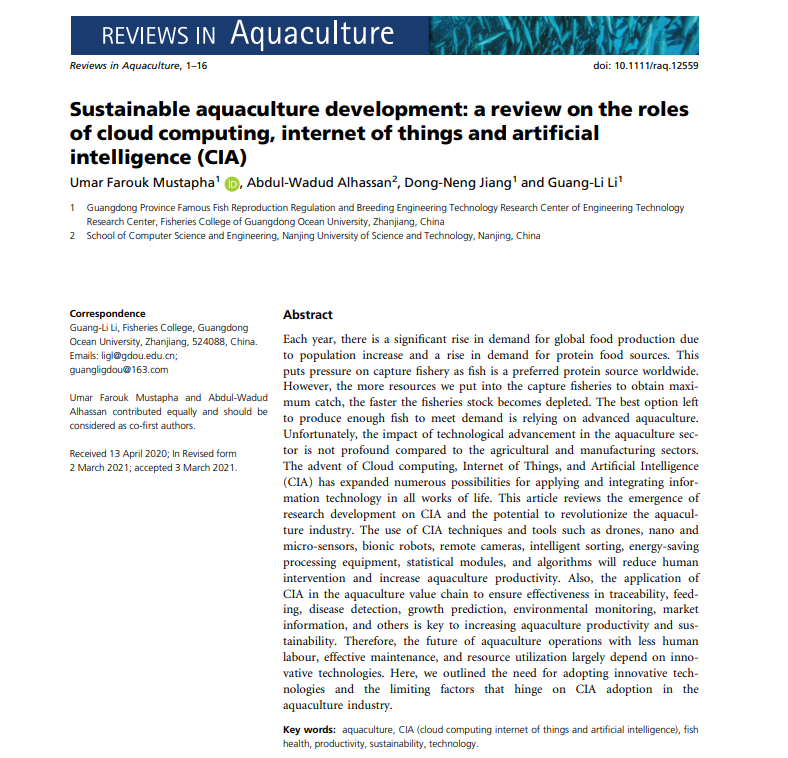 2021年3月,国际著名学术期刊Reviews in Aquaculture(农林1区top期刊,IF: 7.772)在线发表了我校william威廉中文官网水产生物技术研究团队综述论文《Sustainable aquaculture development: a review on the roles of cloud computing, internet of things and artificial intelligence (CIA)》(https://doi.org/10.1111/raq.12559)。2019级博士生Umar Farouk Mustapha为第一作者,李广丽教授为通讯作者。该研究得到国家重点研发计划、国家自然科学基金、广东省自然科学基金及广东省创新团队建设项目的支持。