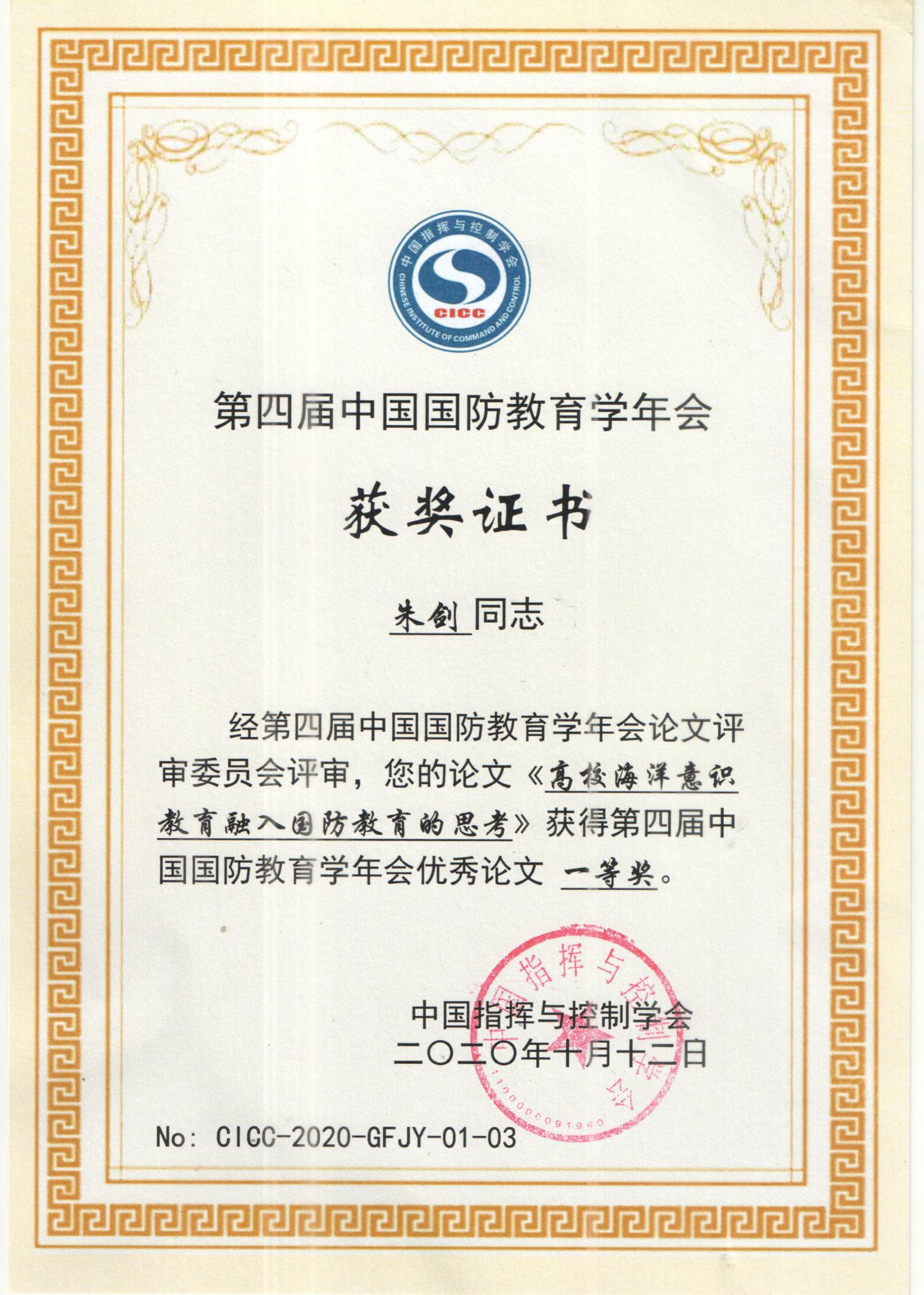 日前,在上海同济大学举办的第四届中国国防教育学年会中,william威廉中文官网教师朱剑喜获“第四届中国国防教育学会优秀论文一等奖”。并应邀以《高校海洋意识教育融入国防教育的思考》为题进行了学术交流发言。