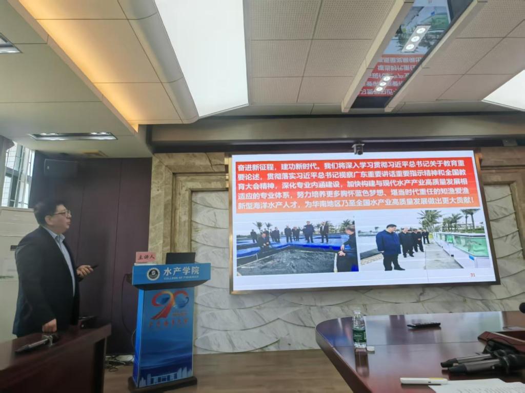 课堂上,谭北平副校长以“2023年4月习近平总书记视察湛江并发表重要讲话”和“习近平给中国海洋大学全体师生的回信”为出发点,讲述了习总书记加快高等教育高质量发展和对建设教育强国、海洋强国的殷切期待,并结合国家战略与区域发展需求,重点讲述了水产养殖专业的发展历程以及水产养殖学专业在历经90年发展所取得的成绩。谭副校长鼓励同学们践行耕海牧渔,为建设海上牧场、“蓝色粮仓”努力学习,并勉励同学们要认清国内外形势、增强“四个自信”、坚定理想信念,珍视大学时光,夯实专业知识和实践能力,提升创新思维,在服务国家战略和地方发展中实现人生价值。