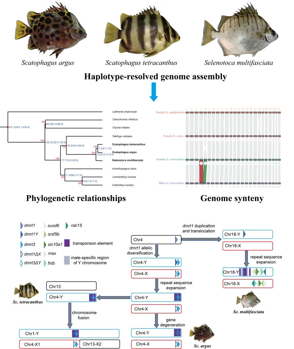 该研究利用全基因组三代测序组装、全基因组重测序、转录组测序、QTL定位和核型分析等技术,揭示了金钱鱼科三种鱼类性染色体转换事件和性别决定候选基因的形成机制。研究发现,在金钱鱼属的金钱鱼(Scatophagus argus)和四棘金钱鱼(Sc. tetracanthus)中,性别决定候选基因dmrt1Y均通过等位基因分化形成,X染色体dmrt1ΔX突变截短,表达极低,失去功能。首次发现四棘金钱鱼雄性个体染色体数目减少1条(2n=47),存在超大Y染色体(Chr1,52.59 Mb)。四棘金钱鱼祖先Y染色体(Chr4)与常染色体Chr13通过罗伯逊易位融合,形成X1X1X2X2/X1X2Y复性性染色体系统。钱蝶鱼属的多纹钱蝶鱼(Selenotoca multifasciata)与金钱鱼一样,都具有XX/XY性别决定系统,且性别决定候选基因也为dmrt1Y,但二者 dmrt1Y起源截然不同。多纹钱蝶鱼常染色体Chr4的dmrt1复制后转座插入Chr18,从而形成新的性别决定候选基因和性染色体。本研究系统揭示了金钱鱼科近缘物种的性染色体经历了快速演化更替,但性别决定候选基因均为dmrt1Y。此外,本研究还组装了三种鱼类性染色体单倍型,比较了它们性染色体序列分化特征,确立它们性别决定区间大小顺序为:四棘金钱鱼>多纹钱蝶鱼>金钱鱼。该科三物种拥有不同的性染色体,且形成与分化时间较短,是研究脊椎动物早期性染色体演化的理想模型。本研究为脊椎动物性染色体起源与演化理论提供了重要数据支撑,为将来研究性染色体在这些物种分化中所扮演的角色提供了数据基础,同时还为该科鱼类单性苗种培育提供了理论依据。