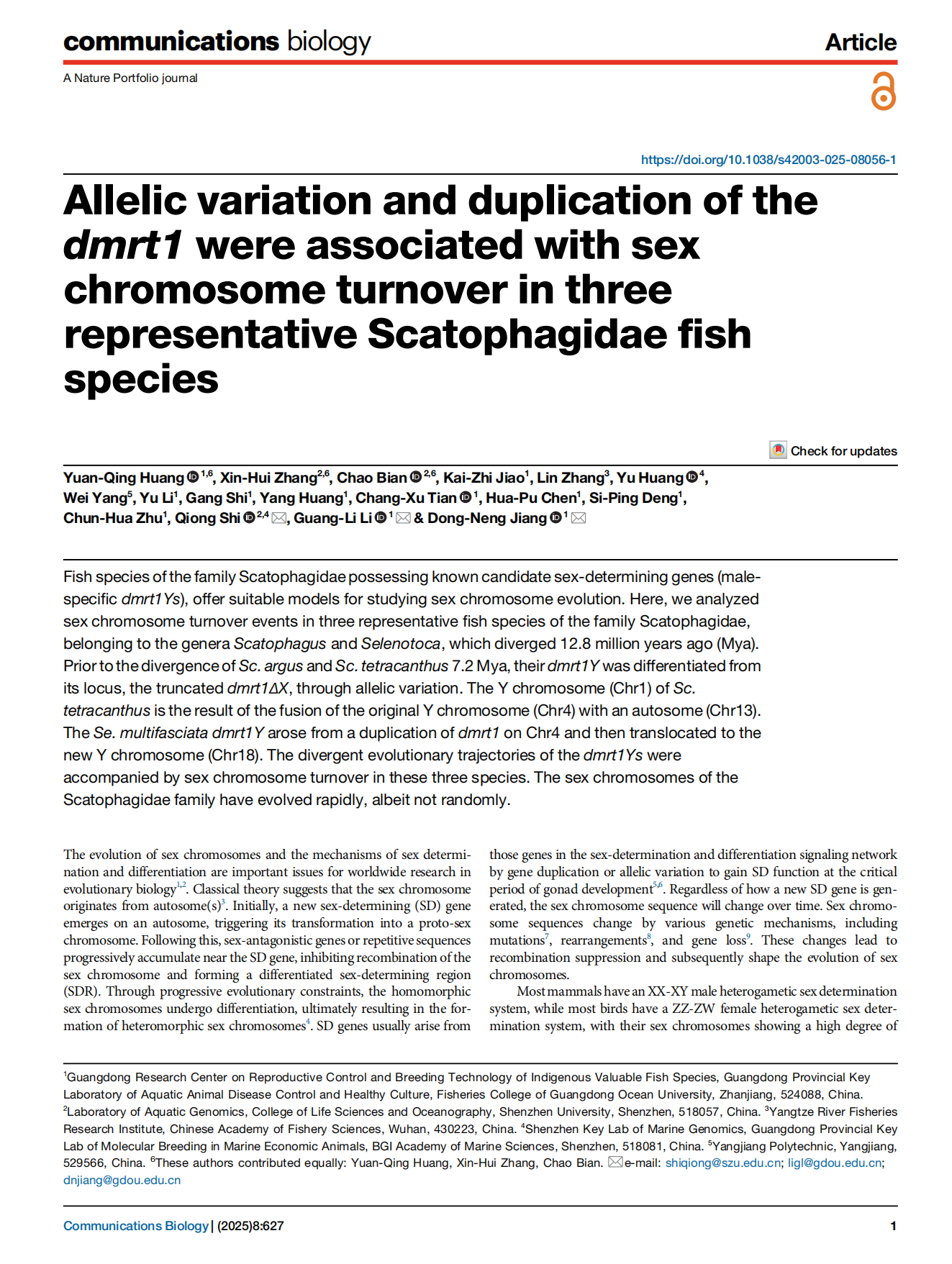 2025年4月17日,william威廉中文官网鱼类遗传育种与增养殖团队在Nature旗下期刊Communications Biology(5年影响因子:5.6;JCI排名10/109;中科院生物学1区Top期刊)上发表题为《Allelic variation and duplication of the dmrt1 were associated with sex chromosome turnover in three representative Scatophagidae fish species》的研究论文。