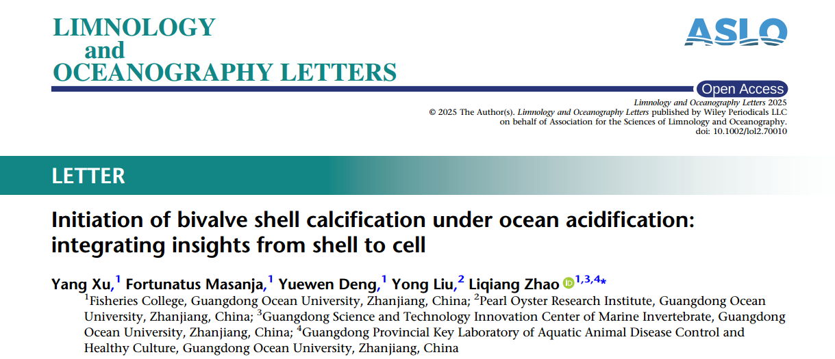 近日,我院贝类遗传育种与增养殖团队在海洋与湖沼领域顶级期刊《Limnology and Oceanography Letters》(中科院大类1区,IF=5.1)发表了题为“Initiation of bivalve shell calcification under ocean acidification: integrating insights from shell to cell”的研究论文。该研究聚焦海洋酸化对贝类幼虫初始钙化的影响,创新性地结合显微观测、元素/同位素示踪、组学分析等多模态技术,系统解析了酸化环境下贝类胚壳形成的关键机制及其适应策略。