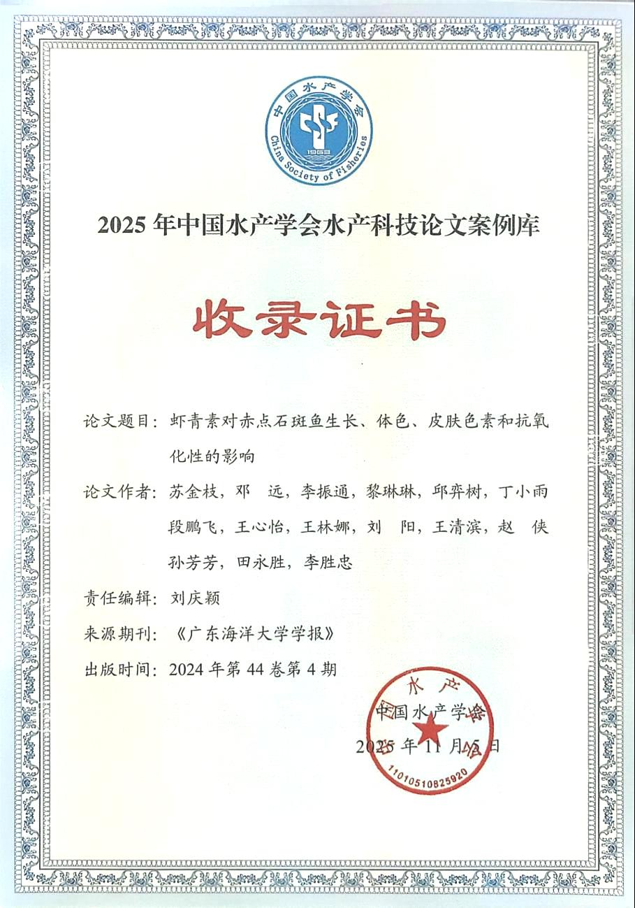 同时,我校章双教授团队发表的论文《饲料中添加β-葡聚糖对珍珠龙胆石斑鱼生长性能、免疫指标、转录组及肠道菌群的影响》,以及《广东海洋大学学报》刊载的《虾青素对赤点石斑鱼生长、体色、皮肤色素和抗氧化性的影响》入选“2025年中国水产学会水产科技论文案例库TOP10”。这既是对我校科研工作者学术能力的高度认可,也彰显了学报在水产学术研究领域的影响力。