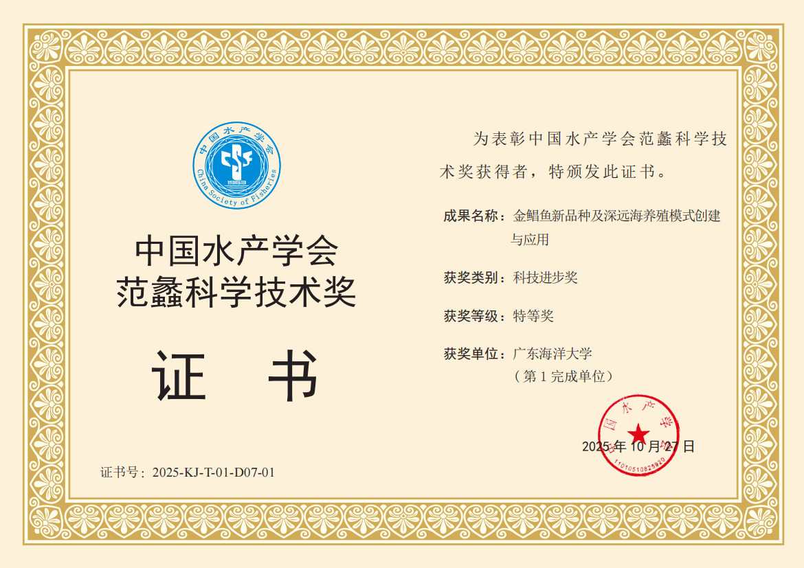 11月5日,2025年中国水产学会范蠡学术大会暨第七届范蠡科学技术奖颁奖活动在辽宁大连举行。我校颜云榕教授团队领衔完成的成果“金鲳鱼新品种及深远海养殖模式创建与应用”荣获科技进步特等奖。