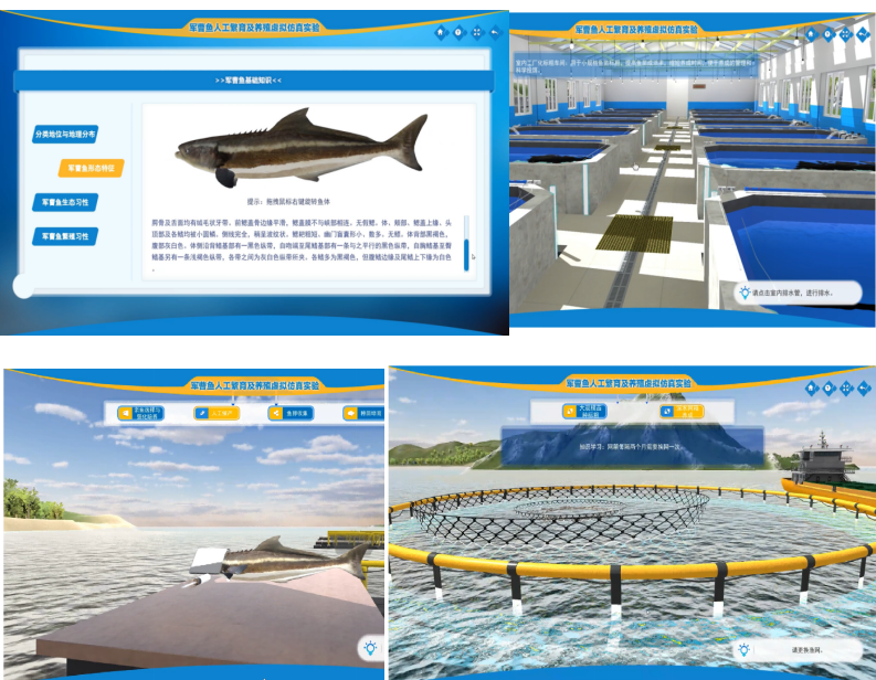 该案例利用虚拟仿真技术,突破了时空限制,构建了军曹鱼“亲本筛选-人工繁育-种苗培育-成鱼养殖”全生命周期虚拟仿真实验平台,解决了鱼类养殖育种传统教学中实验周期长、场地不足、经费有限等问题。通过多模式学习和虚拟操作,提供了更生动、直观、轻松的学习体验。