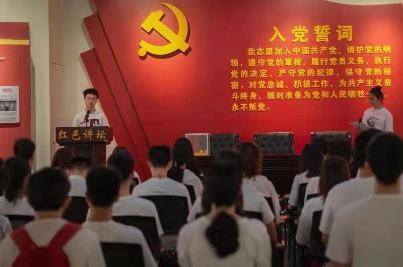 纪念馆参观结束后,学院党委副书记王海燕带领全体党员来到柑村革命烈士纪念碑前,敬献花圈,鞠躬默哀,面对党旗庄严宣誓,重温入党誓词,接受党性洗礼。
