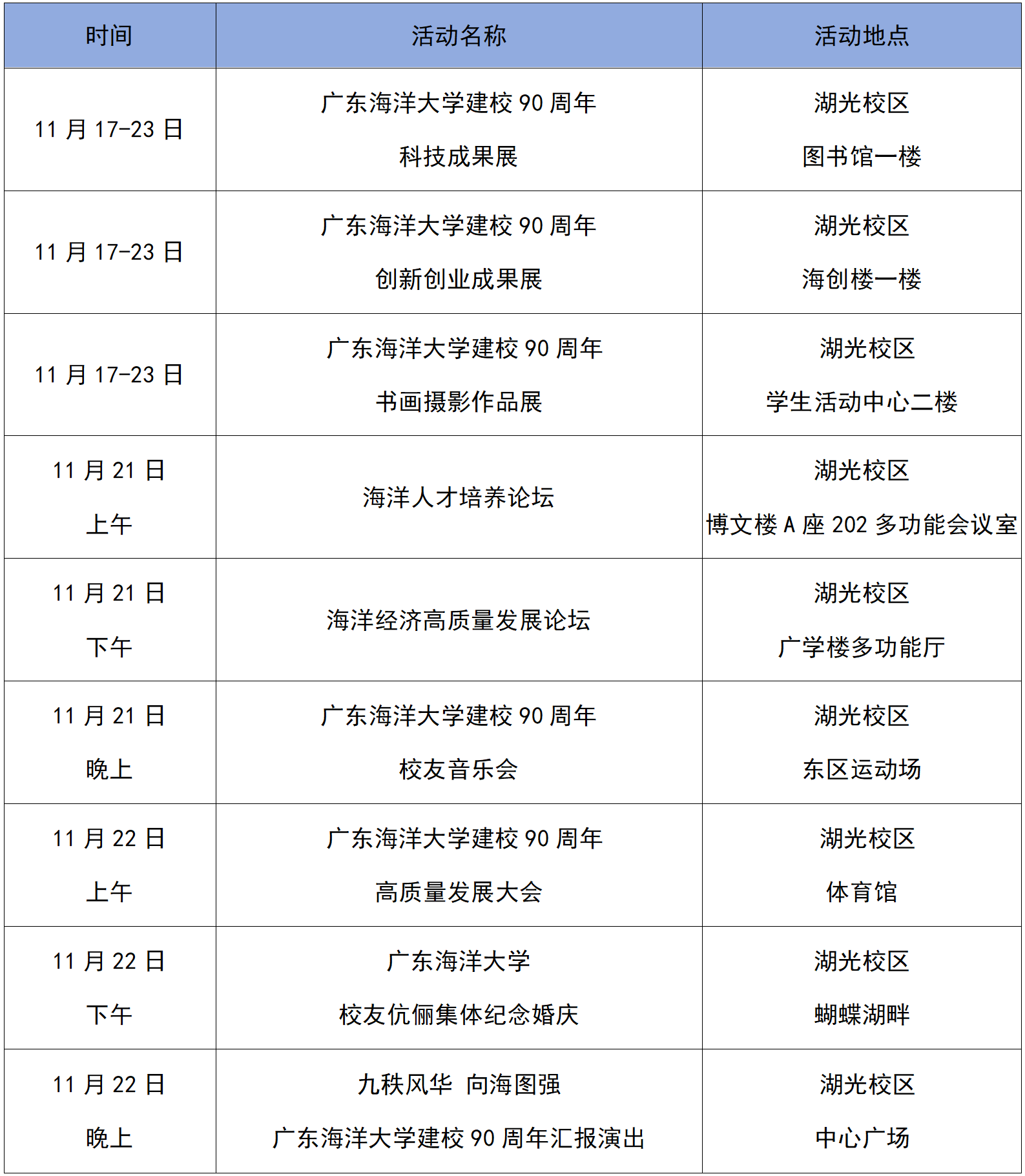 薪火相传,勠力同心。九秩心益壮,四海志正隆,建校90周年,这是一个承前启后、继往开来的历史坐标,既是我们展示过往办学成绩的深情回望,更是面向未来共谋发展的崭新起点。学校将于11月22日举办建校90周年高质量发展大会,并在校庆期间举办系列活动(详见附件活动安排)。我们再次发出诚挚邀请,殷切期盼海内外校友齐聚校园、共忆芳华、共叙情谊;热烈欢迎广大师生员工、离退休老同志齐赴盛会、共享荣光、共庆华诞。诚挚邀请关心学校发展的各界宾朋相聚海大,奔赴并见证这场跨越90年的荣耀之约,共贺盛事、共襄盛举!
